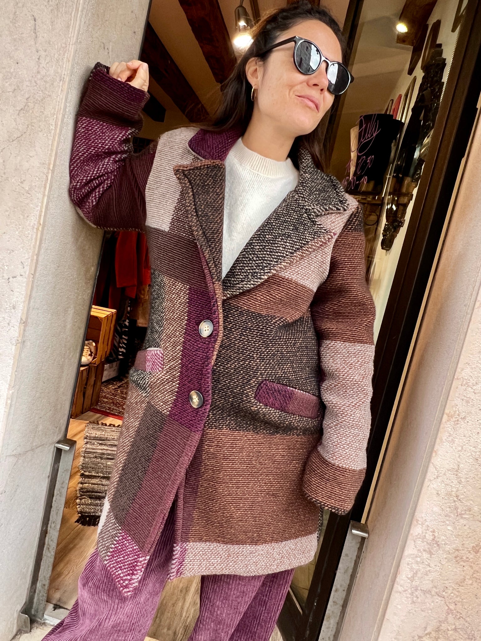Cappotto in lana a fantasia. Fodera interna, chiusura con bottoni. taglia unica