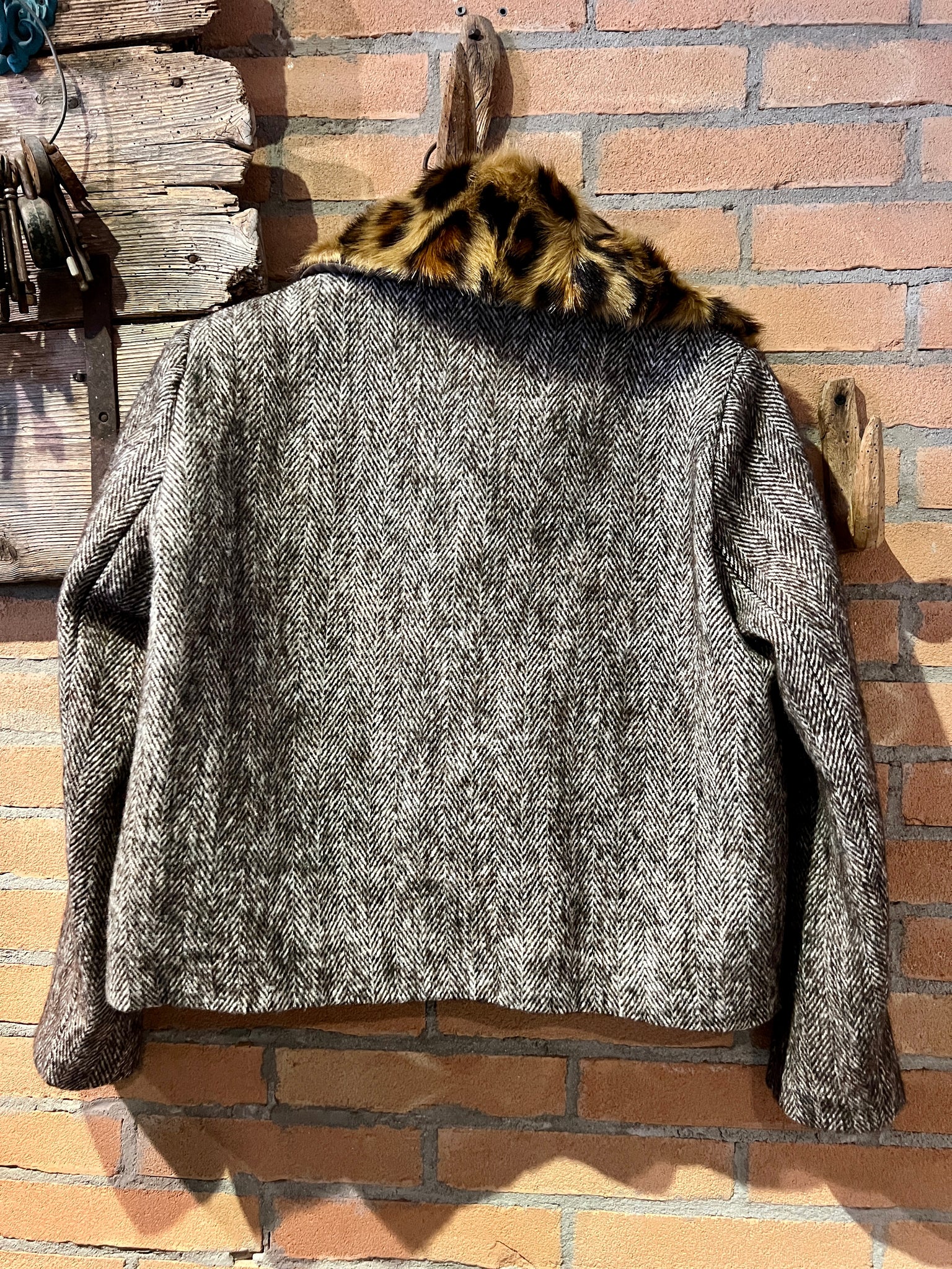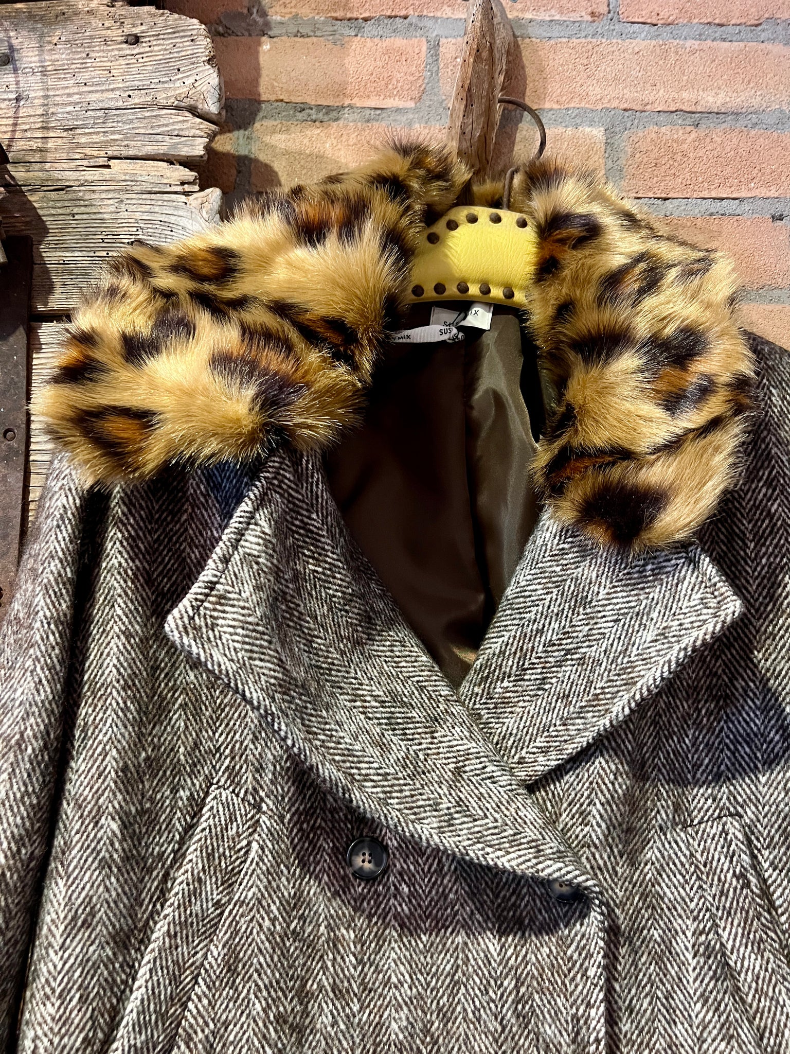 Cappotto corto a fantasia spinata panna e marrone con collo estraibile in Ecopelliccia a fantasia animalier.