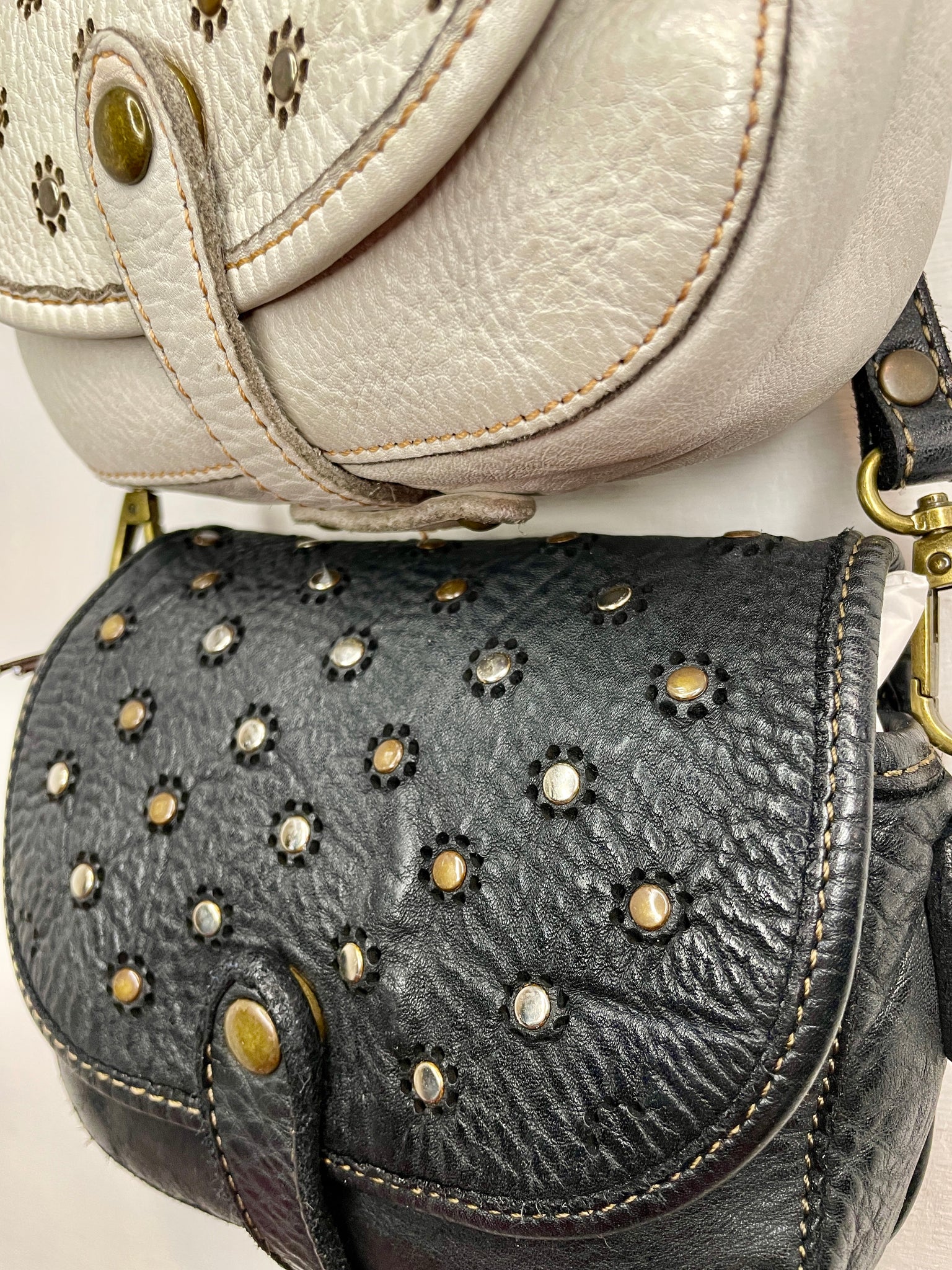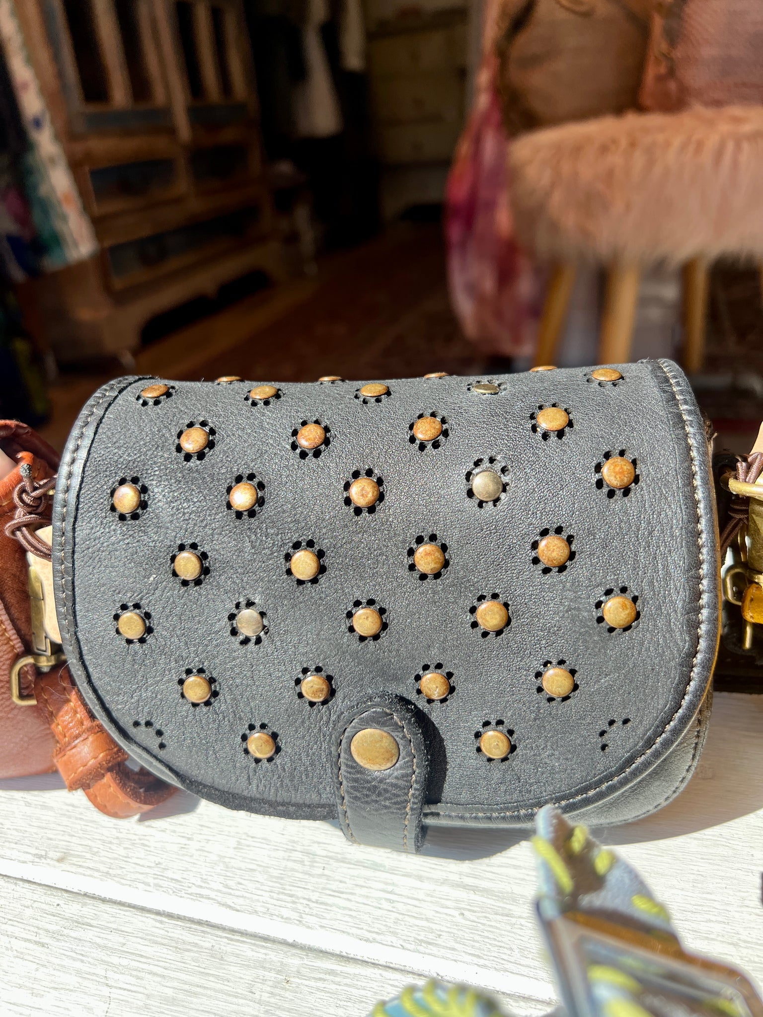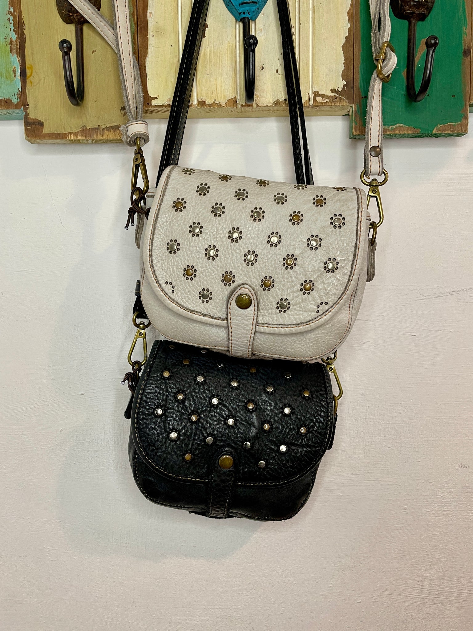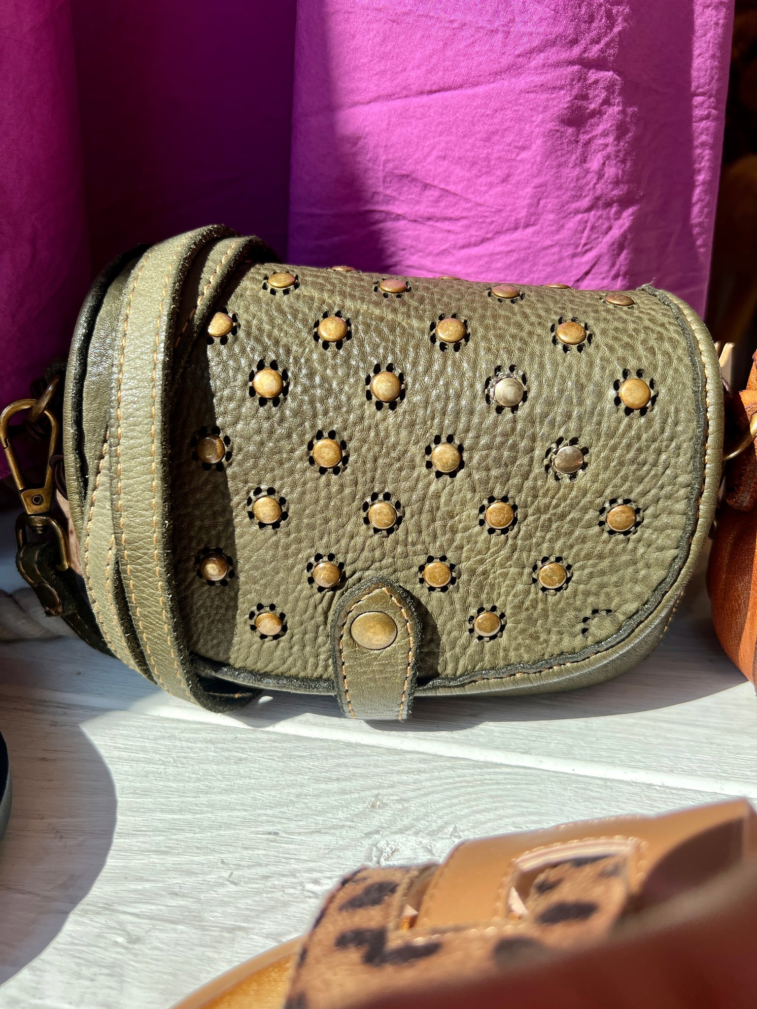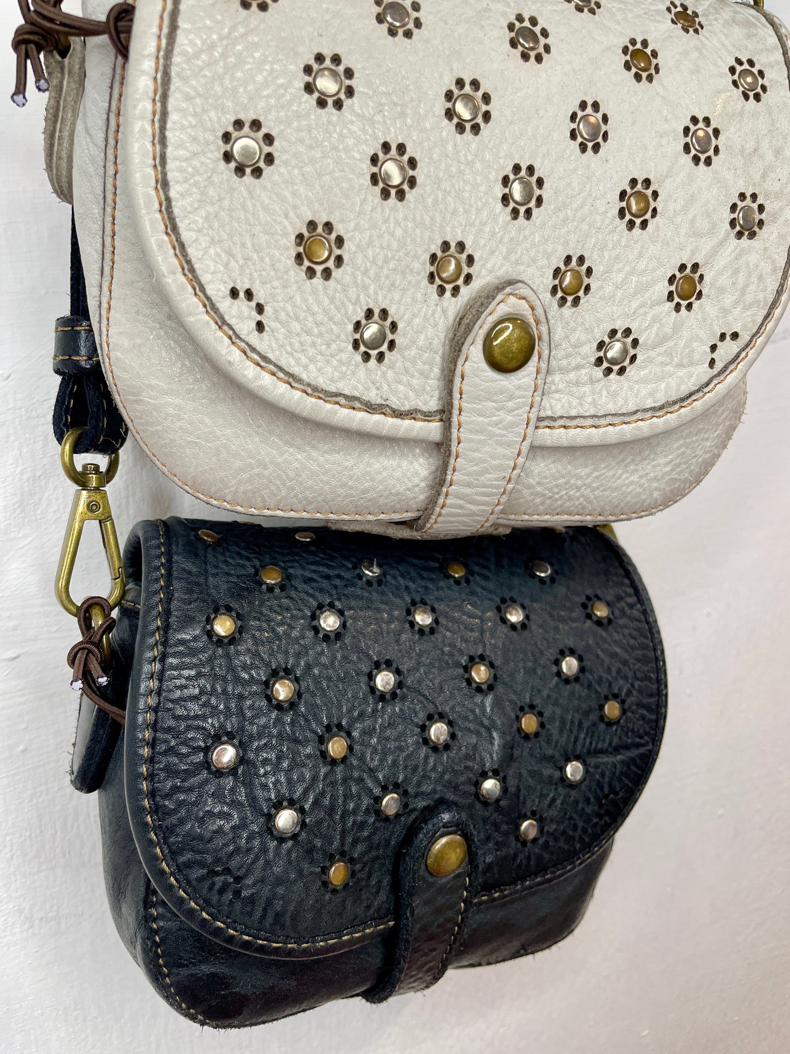 Pochette mini in vera pelle lavorata artigianalmente. Chiusura con patta laserata e borchiata. Tracolla regolabile, fodera interna con taschino.