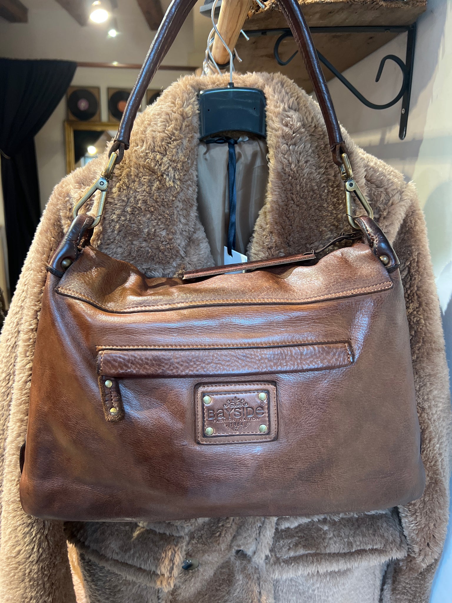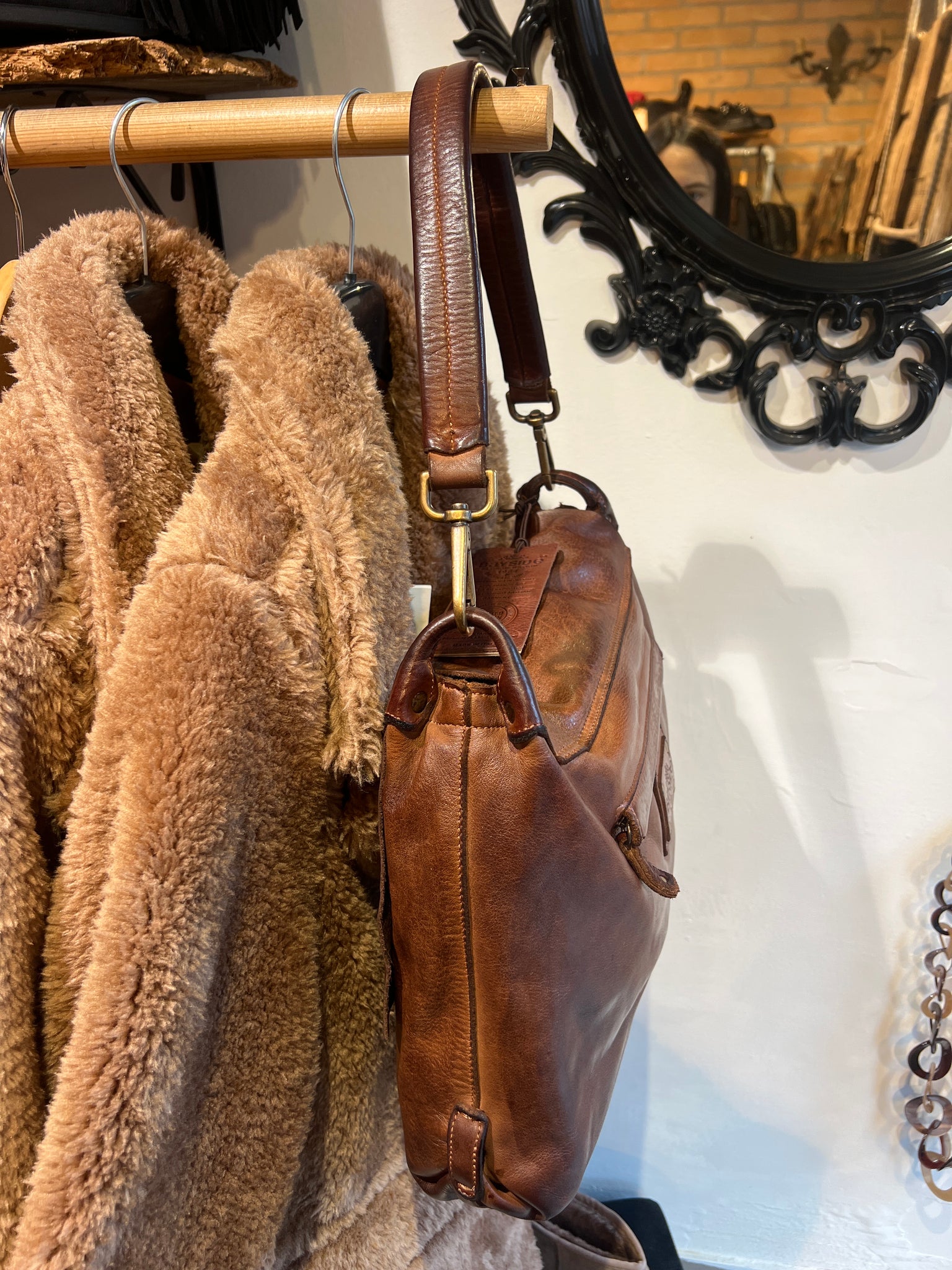 Borsa in pelle lavorata artigianalmente. Tracolla corta da spalla e tracolla regolabile. Chiusura con cerniera e patta con calamita. Tasche interne e una esterna.