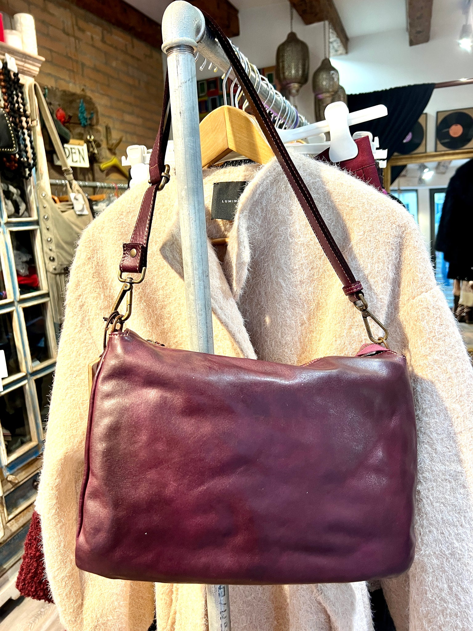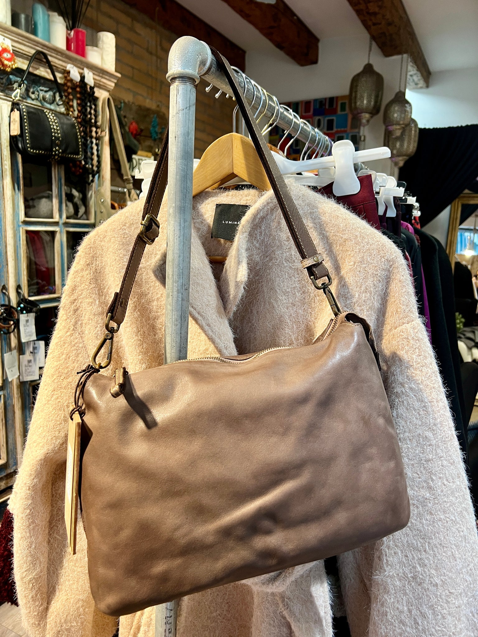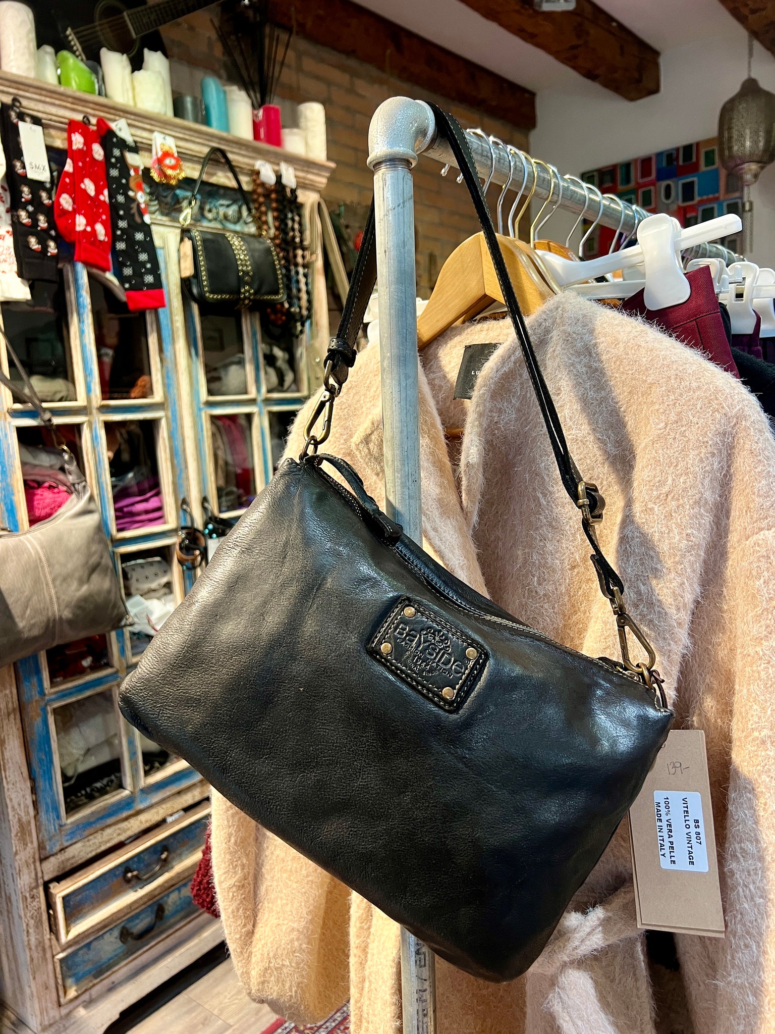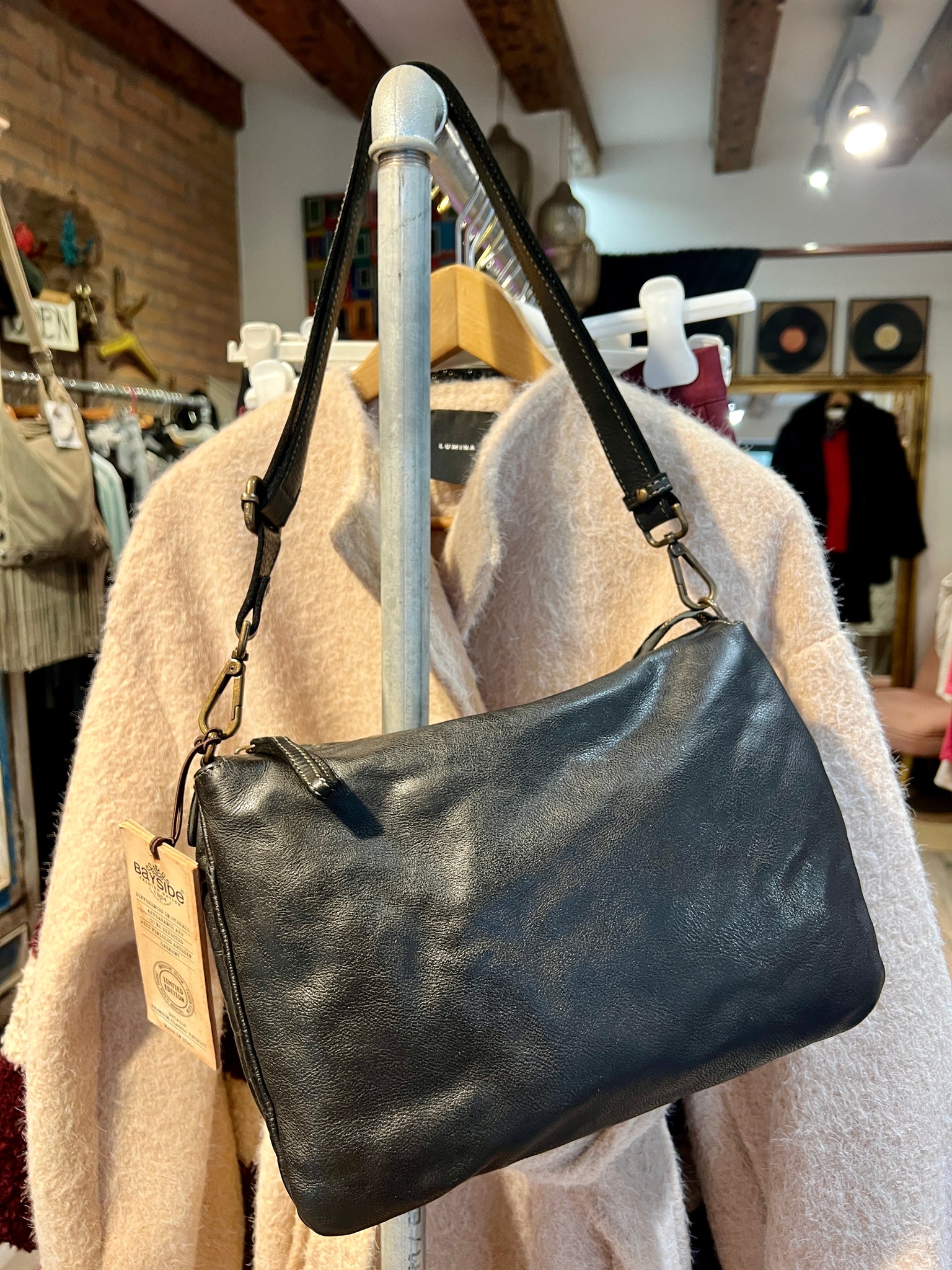 Borsa in pelle lavorata artigianalmente. Numerose tasche interne, tracolla regolabile e chiusura con cerniera.