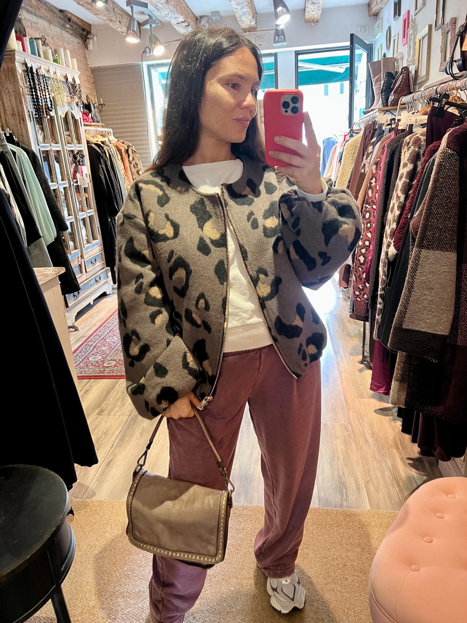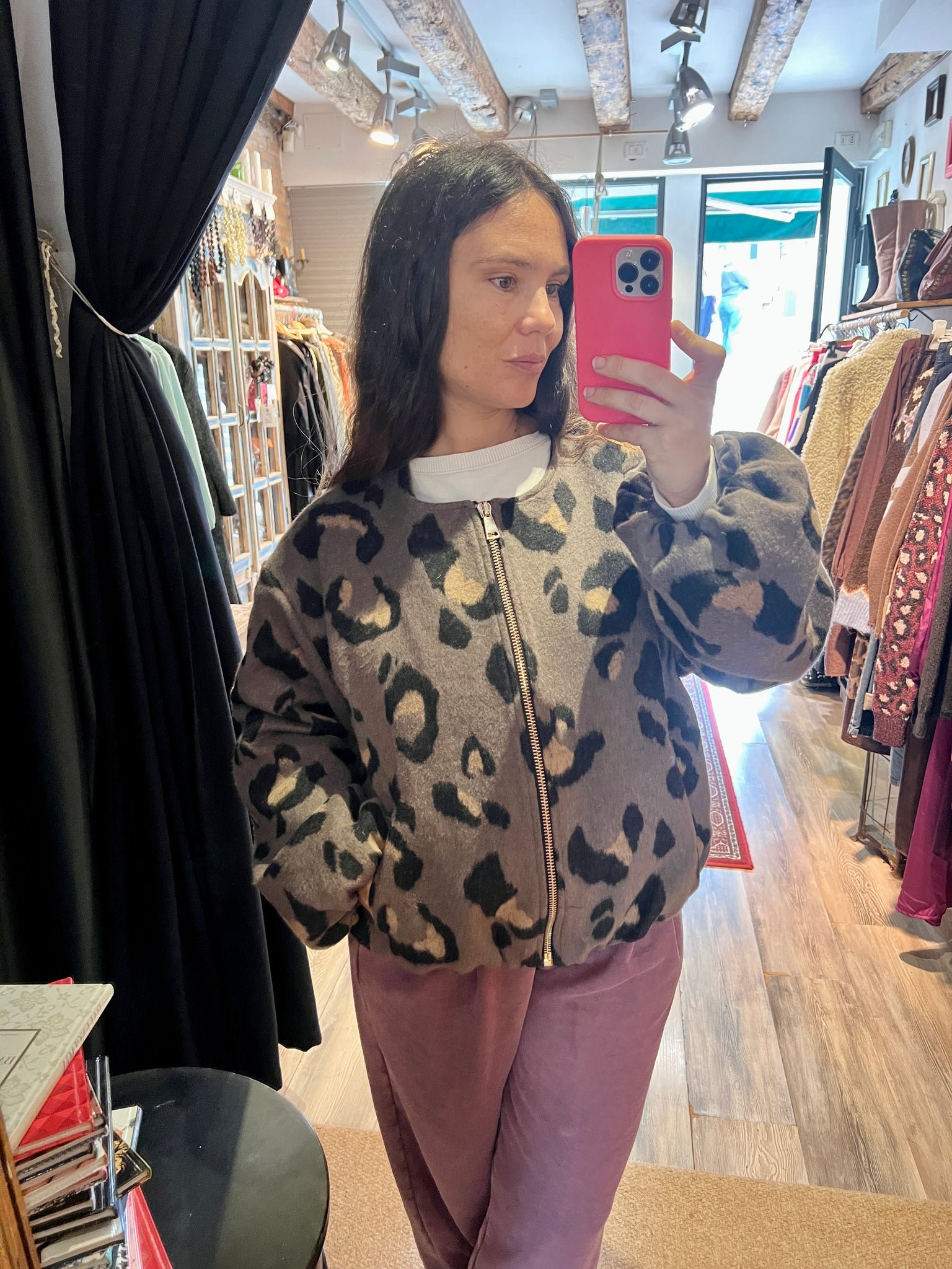 Bomber girocollo a fantasia animalier. Chiusura con cerniera e tasche esterne. 43% cotone 54% poliestere 3% altre fibre