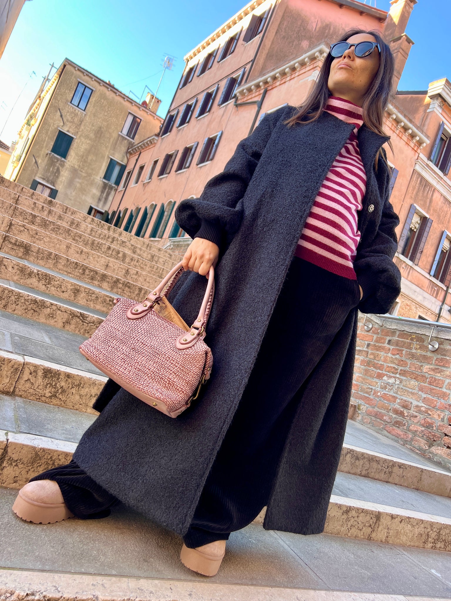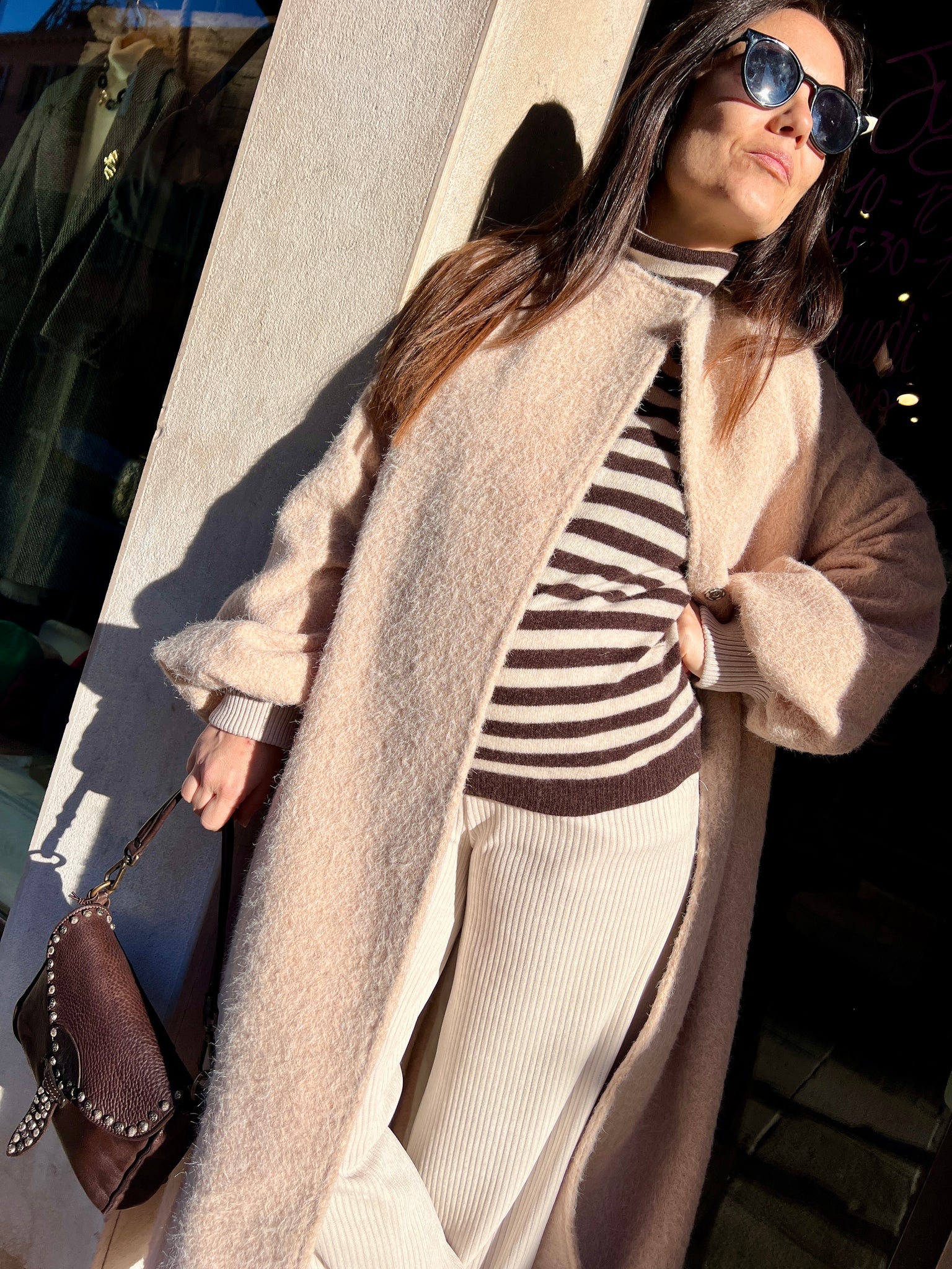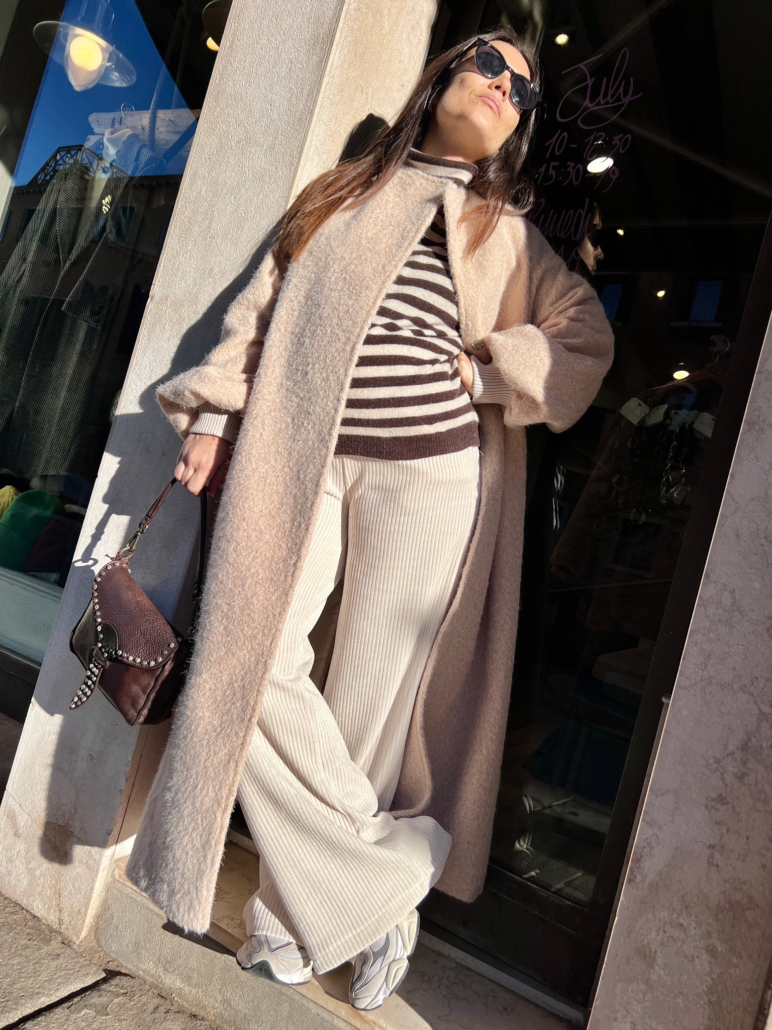 Cappotto lungo effetto lana cotta. Chiusura con bottoni a pressione e cintura in vita. Tasche esterne, maniche ampie.