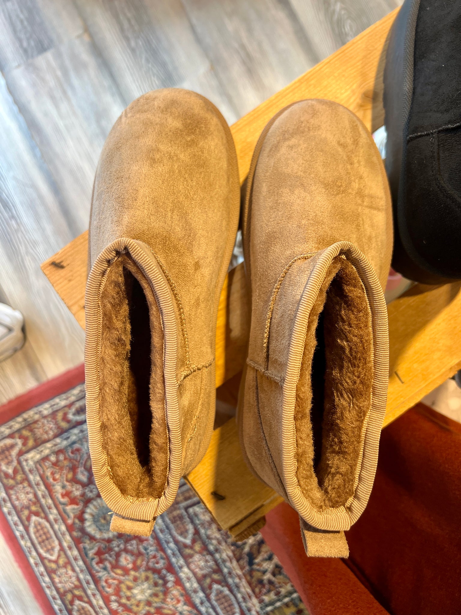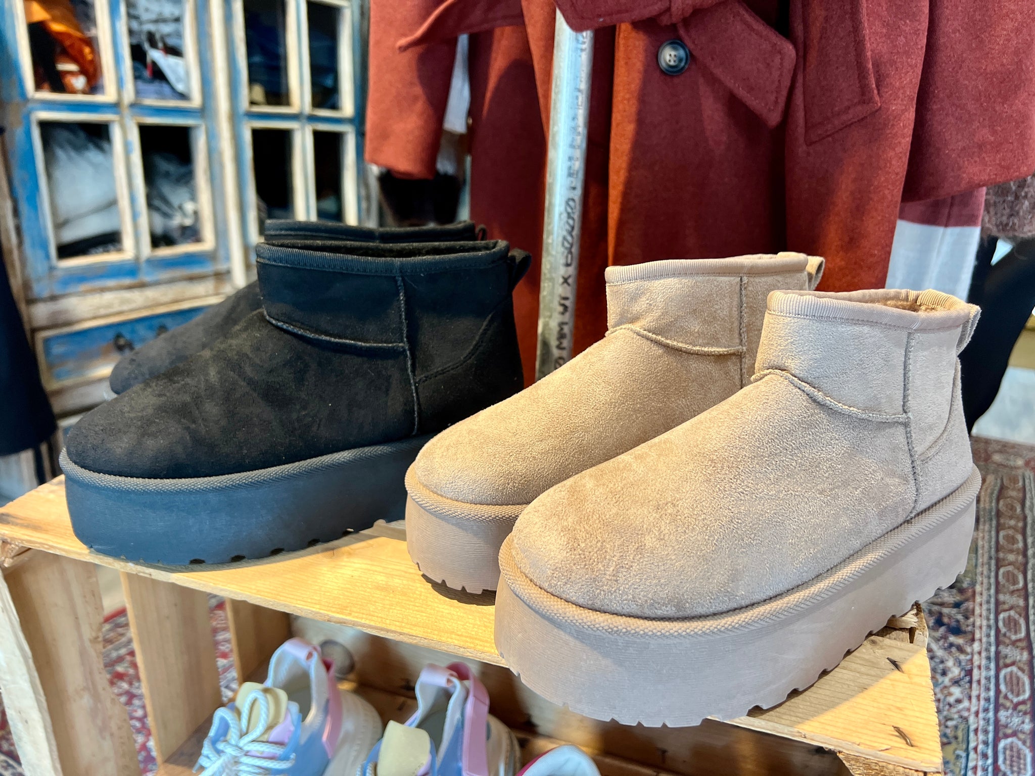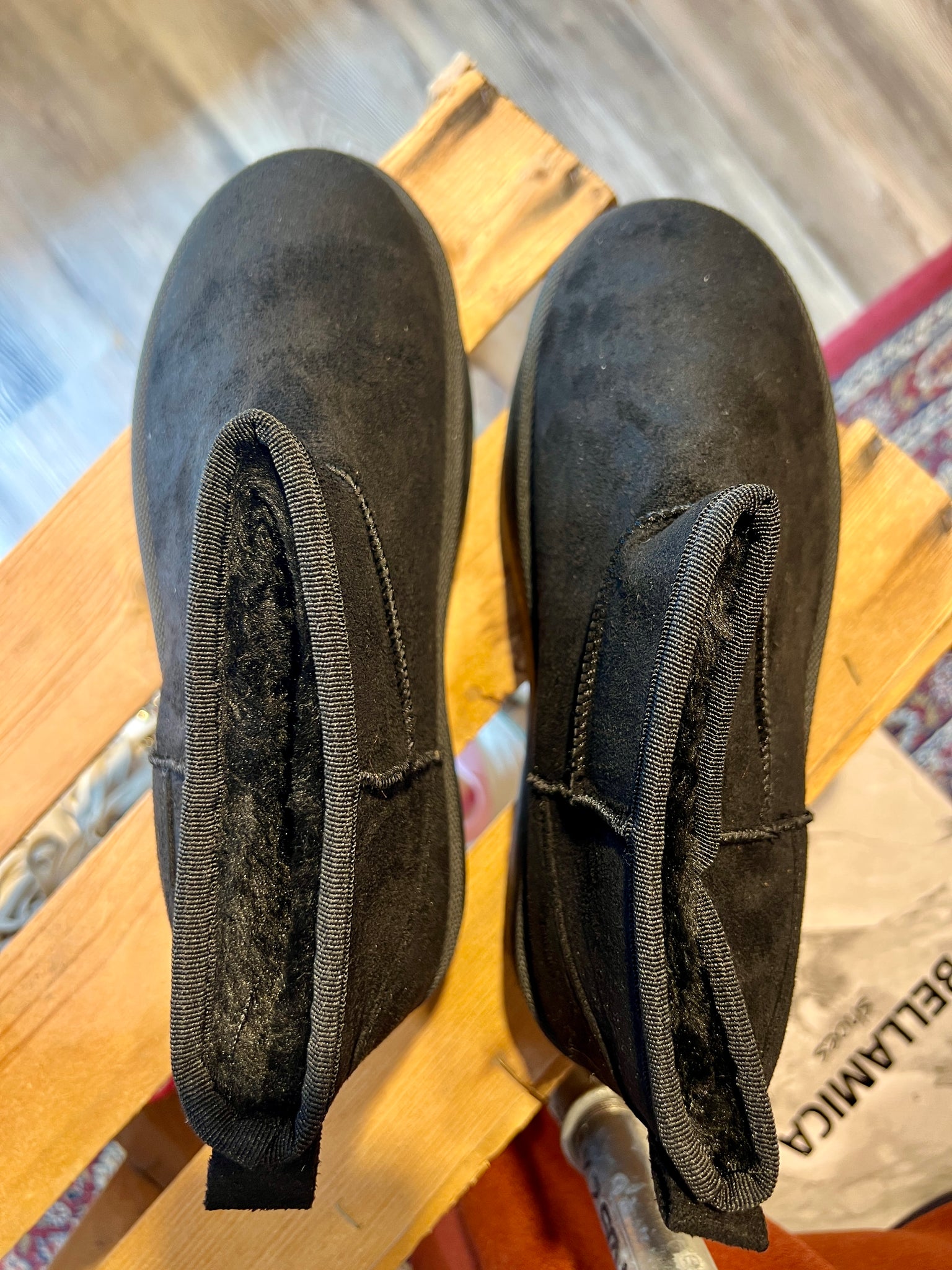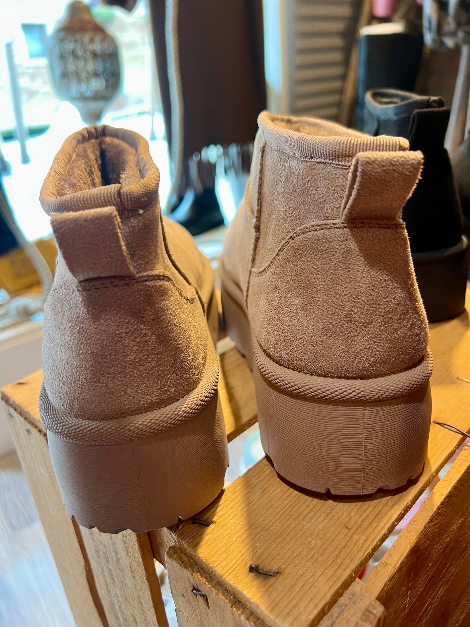 Stivaletti bassi scamosciati in eco-pelliccia. Plateau di 5 cm.
