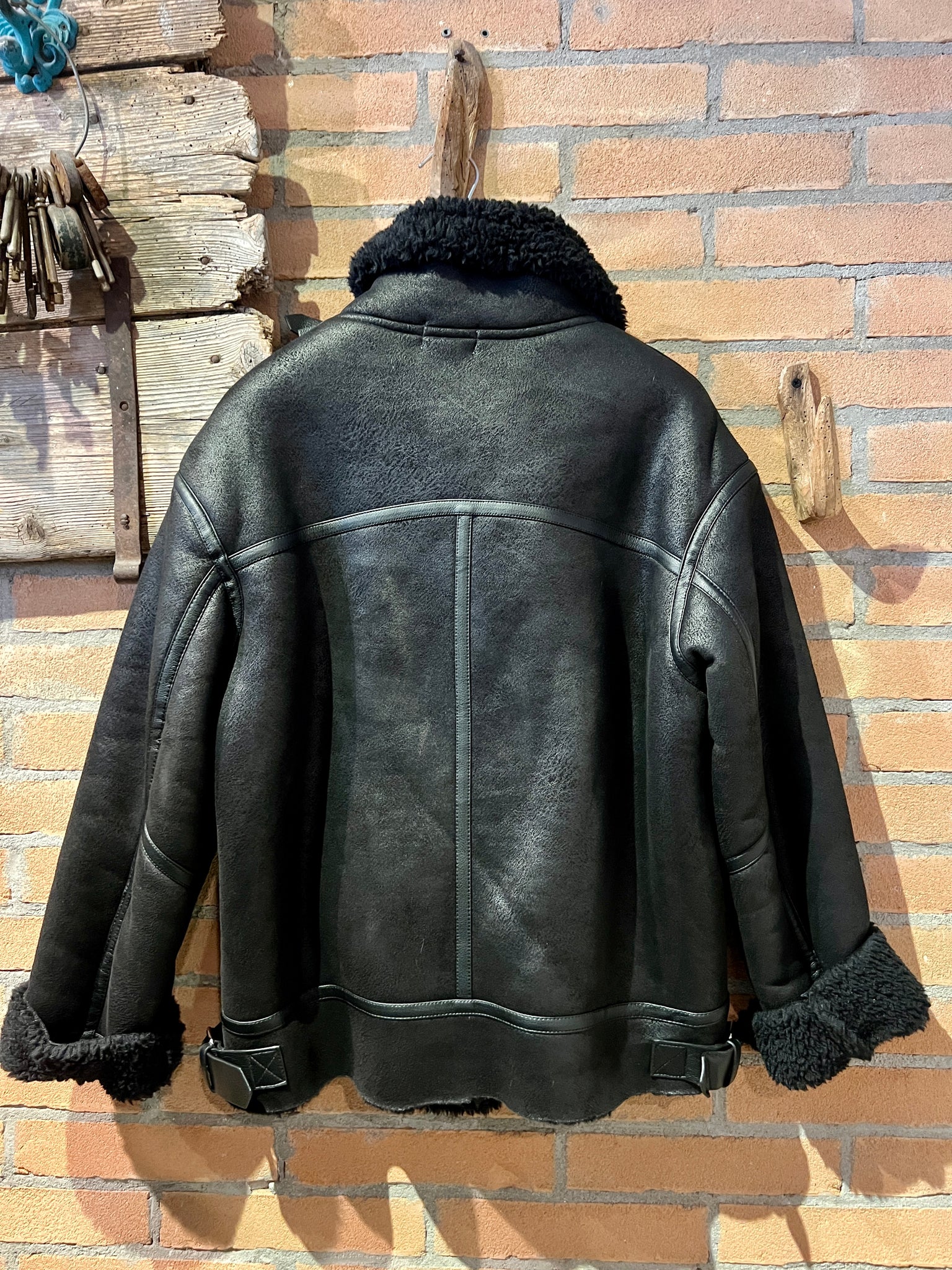 Eco-montone modello chiodo con chiusura laterale, tasche esterne e fibbie regolabili su collo e fianchi.